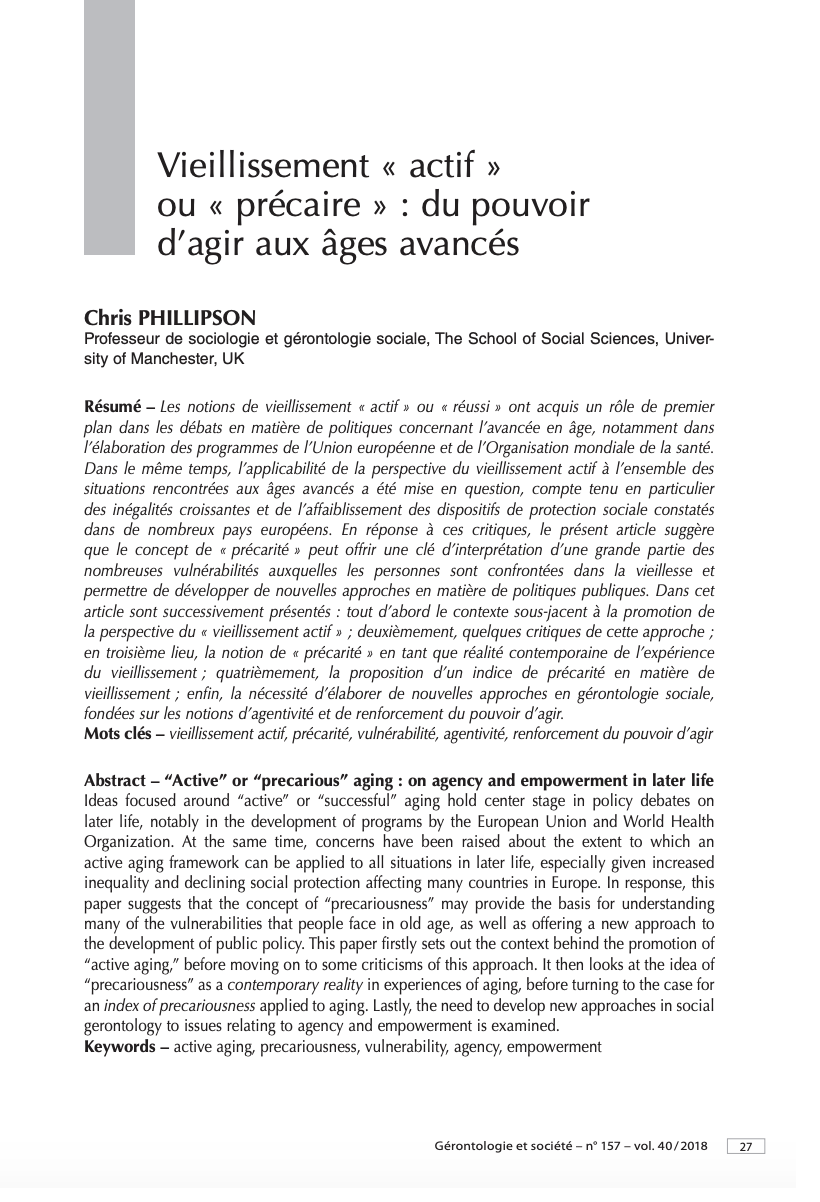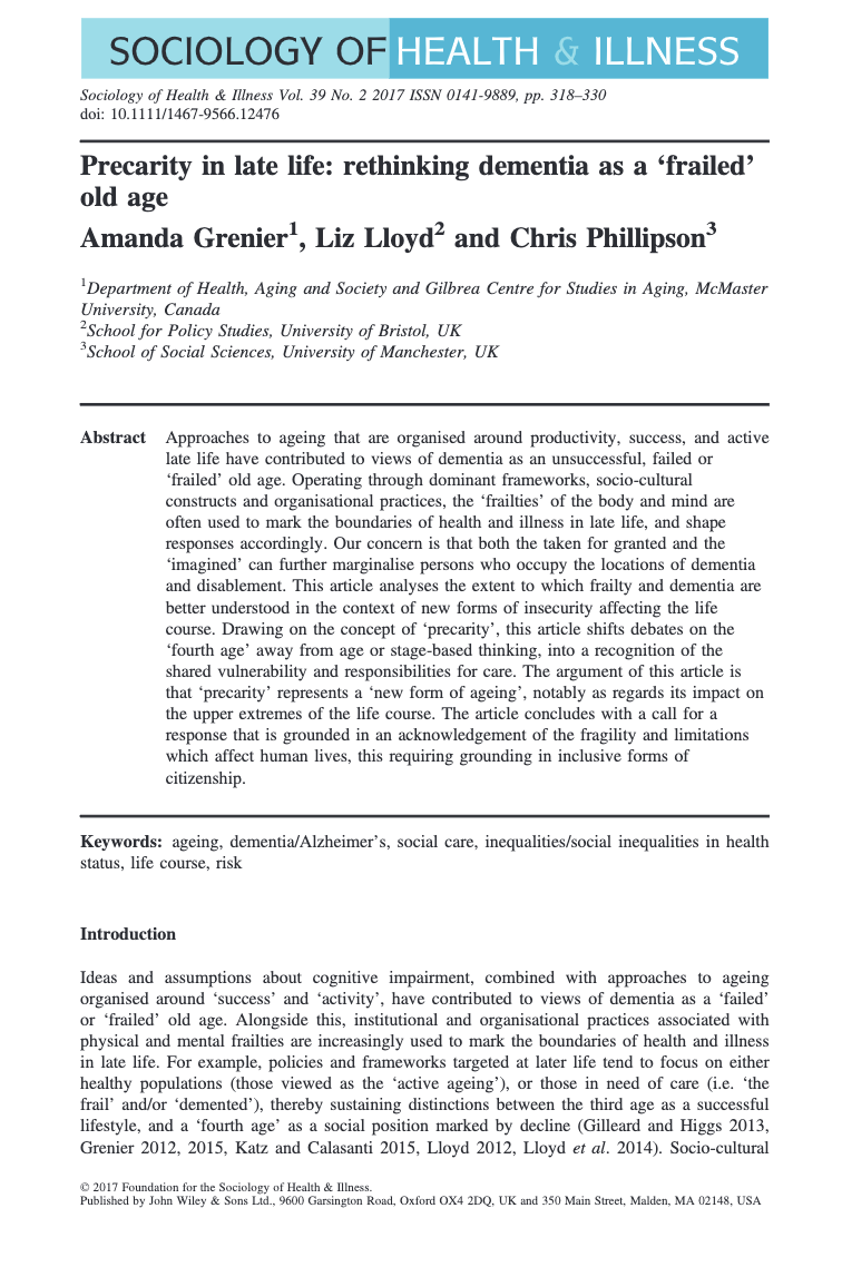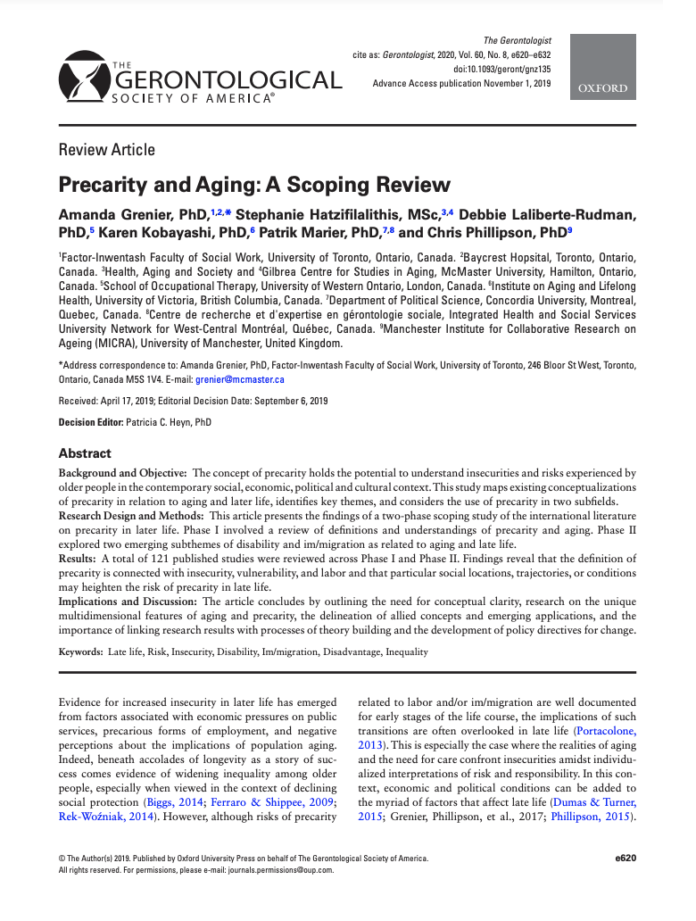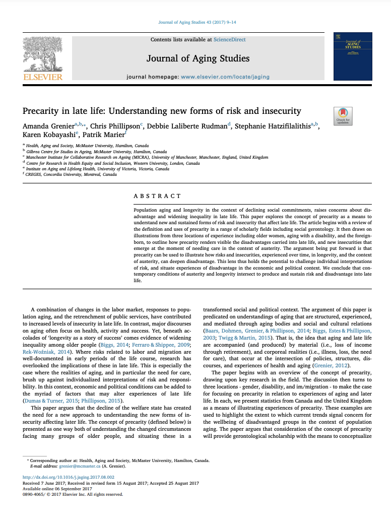 “Our suggestion is that precarity offers a complementary and interdisciplinary lens to understand inequality by building on existing models such as cumulative advantage and disadvantage, the social determinants of health, and/or social exclusion, while at the same time incorporating insights from older people.”