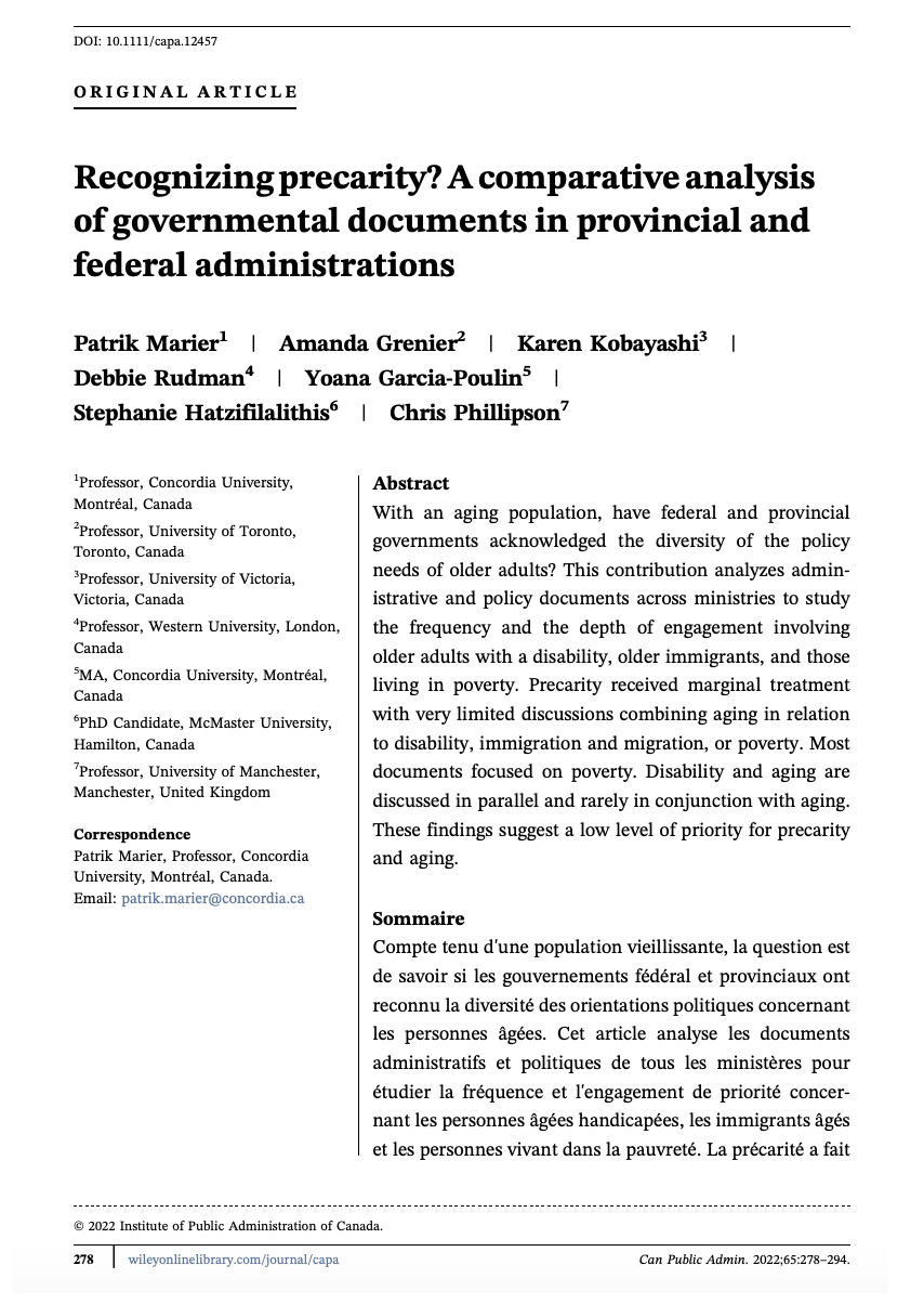 The research results reported on this website were developed as part of an Insight grant from the Social Sciences and Humanities Research Council of Canada (SSHRC). The project, entitled “Precarity and Aging: Unequal Experiences in Contemporary Late Life” (Grenier, PI, 2016-2023) aimed to understand and account for trajectories of risk and insecurity in relation to contemporary aging, expected life course transitions and dominant success-based models of aging in Canada. This project considered precarity in relation to aging and late life and explored trajectories of low income, (dis)ability, im/migration and later life. Our team bridged conceptual work on vulnerability, risk and exclusion with stakeholder interviews and policy analysis. Building on these we identified challenges and gaps, and made research-based suggestions to improve the lives of older people.